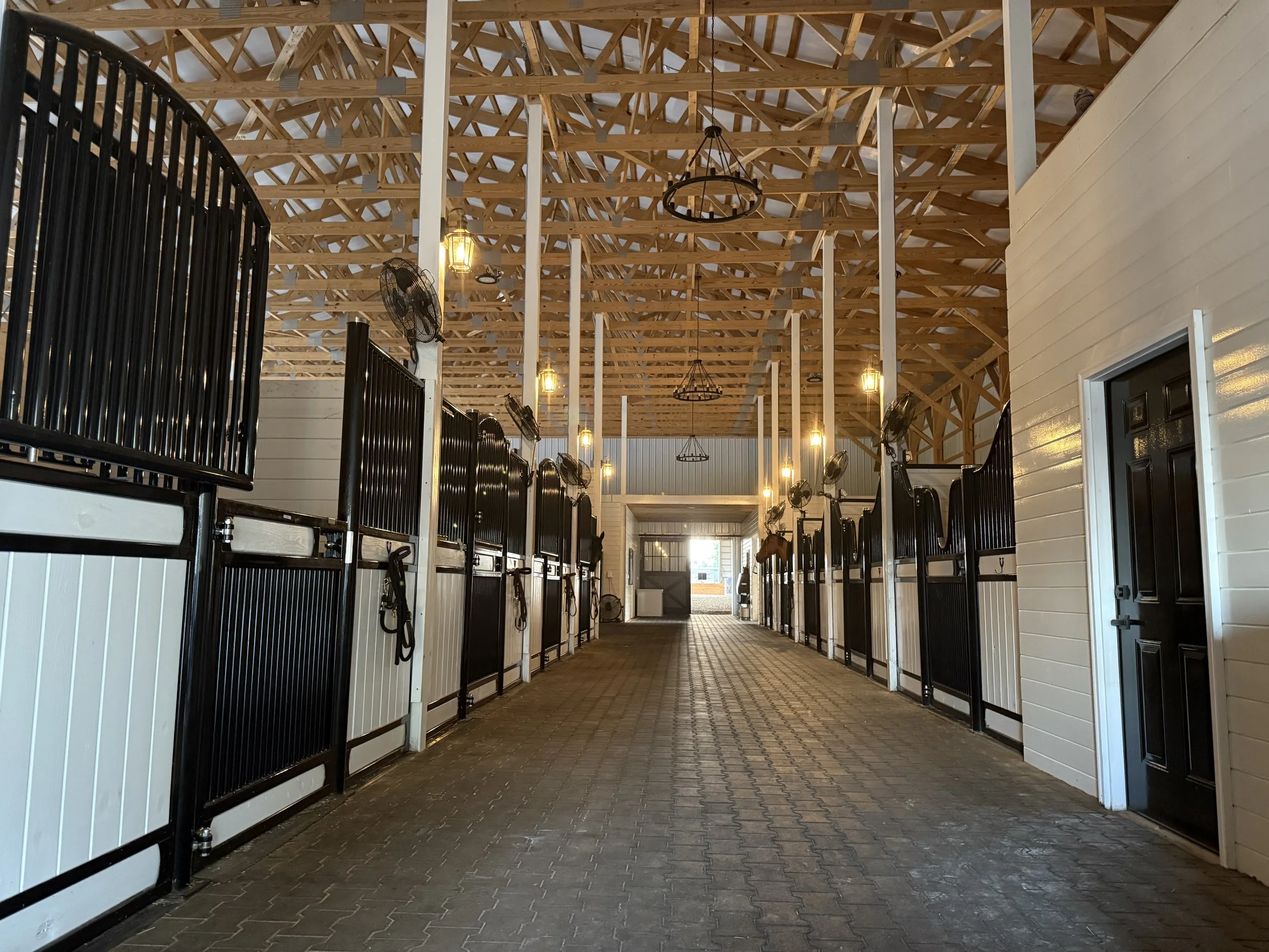 Educated Guess LLC is now operating out of our beautiful KP Ranch, located on 157 acres in Pittstown, NJ. The barn boasts 15 12’x14’ stalls, equipped with custom Stable Comfort stall mattresses, enhancing comfort and well-being while lowering the risk of musculoskeletal disorders and acting as a thermal barrier for joints. An additional 4 12’ x 12’ custom built outdoor stalls are also available. Rubber pavers line the aisles and grooming stalls, ensuring a non-slip surface throughout the entire barn. Clients enjoy a 24’ x 28’ heated and air conditioned tack room and seating area, along with a 200’ x 80’ attached indoor arena complete with a Footing First SRS blend, providing traction, cushion, and stability. Outside are miles of mowed trails with hills for conditioning. Turnout includes 4 80’ x 80’ and 2 180’ x 80’ grass paddocks assembled with 4 rail fencing. 3 additional multi-acre grass paddocks with run in sheds and hay feeders are available for retired horses, broodmares, foals, or those needing additional turnout time.